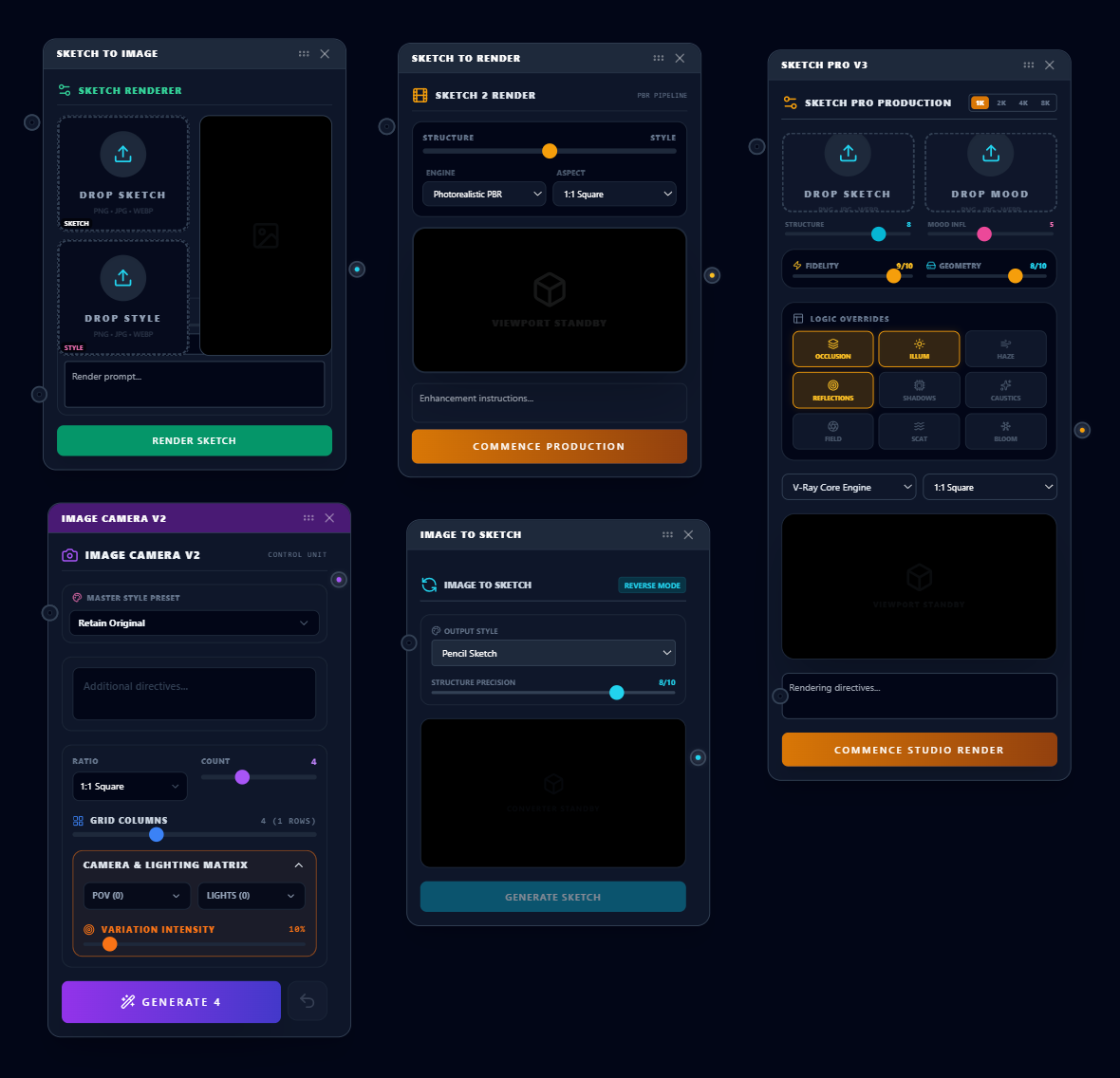A modular generative cluster for structural refinement. It handles everything from Sketch-to-Render to Style-Pro transformations, maintaining 1:1 geometric fidelity while allowing for infinite aesthetic iterations and aspect ratios and scales.