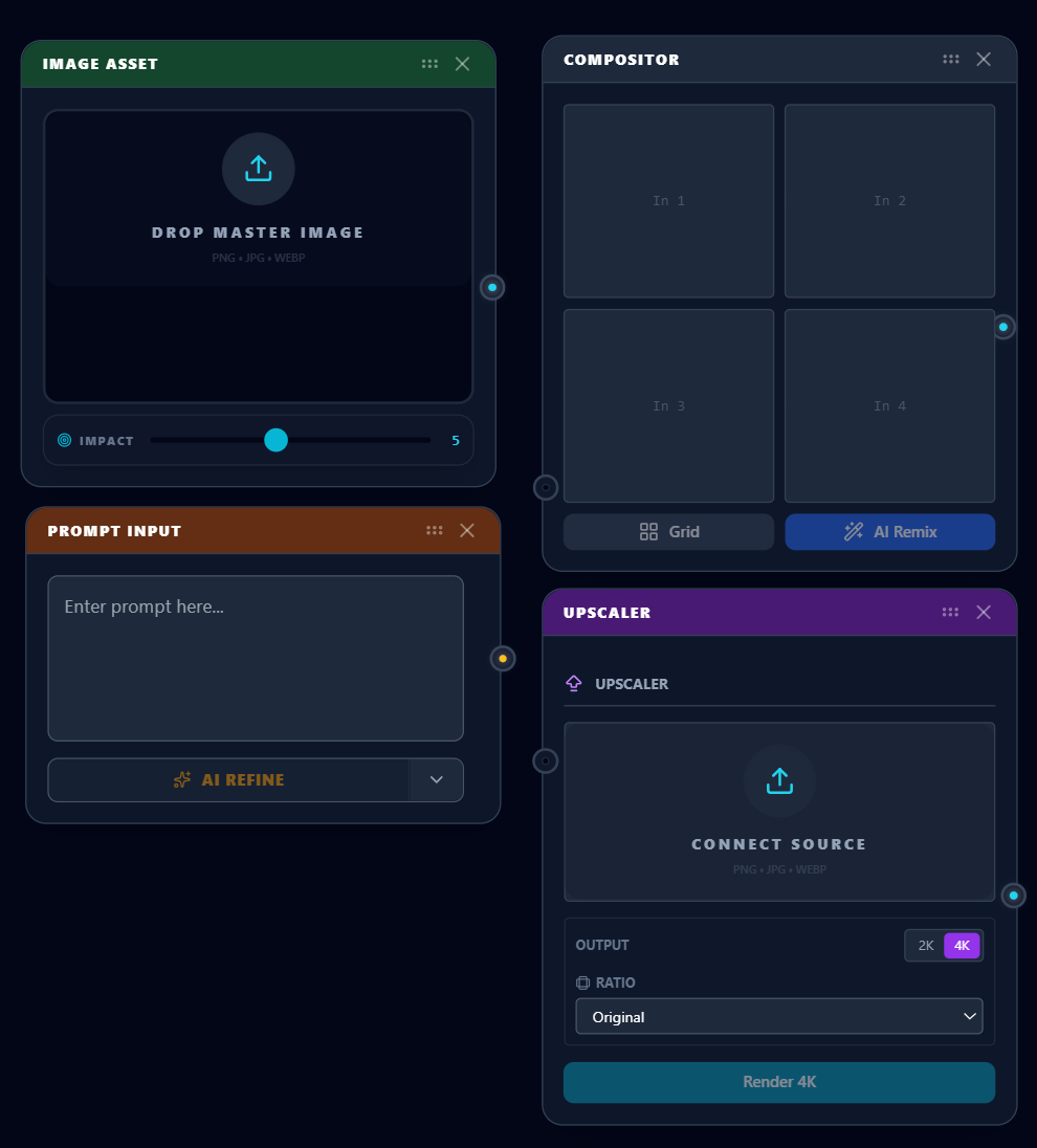 The 'Logic Board' of Kengwood OS. This module manages the technical hand-offs between independent nodes. It controls resolution upscaling (4K to 8K), aspect ratio transmutation, and the data pipeline routing that allows the 'Image Family' to seamlessly plug into the 'Video Family.